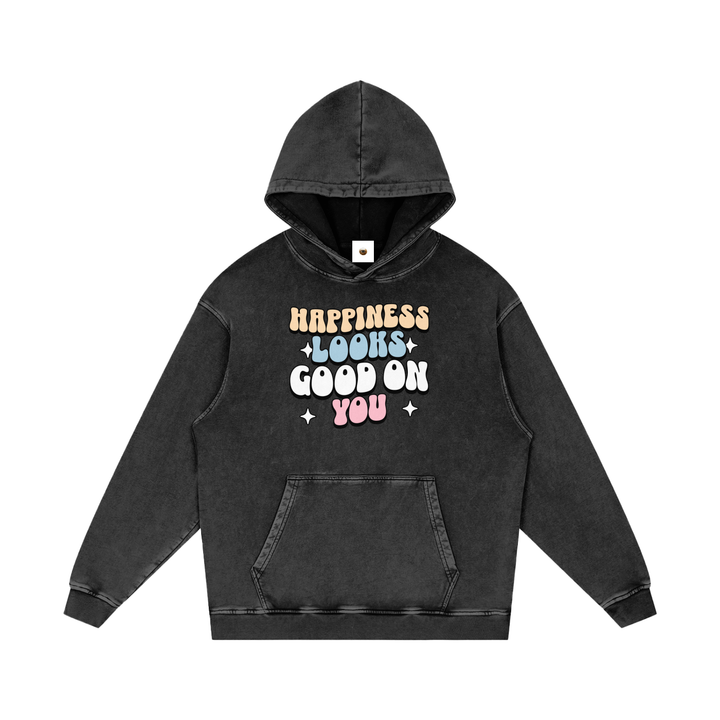 Happiness Looks Good On You Snow Washed Loose Cotton Hoodie